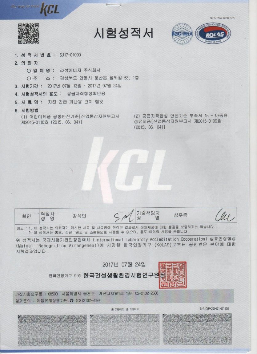 어린이 공통안전기준 KC인증 성적서 번호 SU17-01090